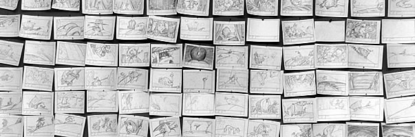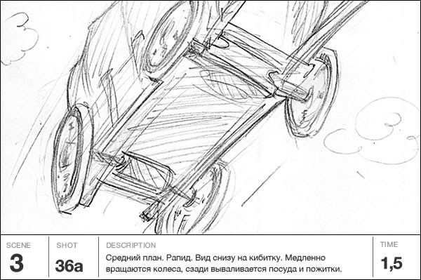 As it is known, a movie or a cartoon consists of separate plans – close, general, middle, distant, etc. So, in the storyboard each future plan is substituted by one or several (to show the motion of the camera) drawings. At first the director draws with the help of simple shapes – the drawings in “dot, dot coma dash…” style, and then the artists create the storyboard of the future movie.
