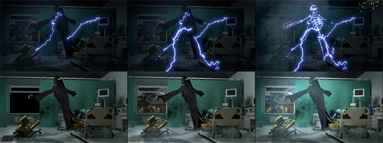 Ничего супер необычного, но весь призрак собирался в 2-х пакетах. Тело и флюиды — Maya. Преломления за персонажем и цвет — Nuke.